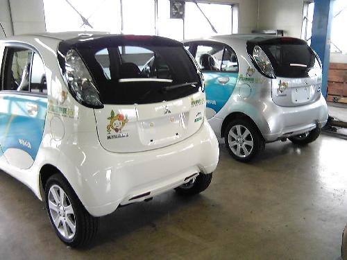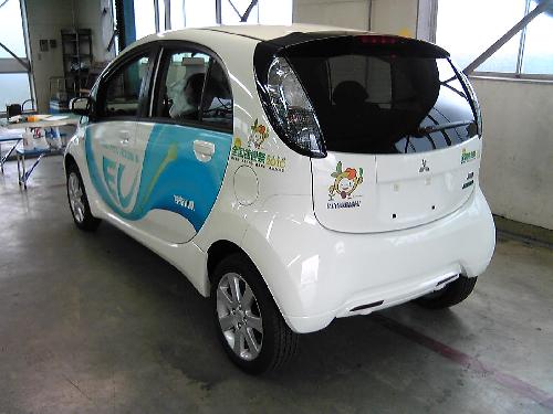 このたび神奈川県に納入された三菱自動車のi-MIEVのラッピングを行いました。環境を意識したデザインになっています。車体色は白2台とシルバー1台です。写真では見えませんが、裏側に巻き込む部分まで丁寧に仕上げてあります。コントロールタックを使った甲斐がありました。あらかじめドアハンドルやキーシリンダーの位置を切り抜いていたので車体には傷一つ付けずに終わらせることができました。