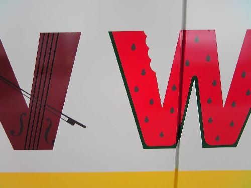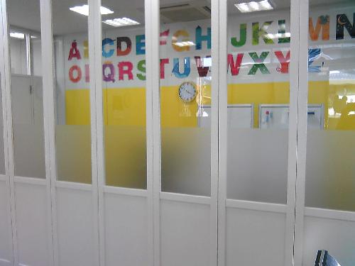 アルファベットは印刷で作りました。パネルに9ミリほどの溝があるのでそこを押し込んでも文字の形が崩れないように工夫してあります。黄色い壁紙はダイノックフィルムです。継ぎ目が見えないようにパネルの溝に押し込んであります。隣の教室の子供の気が散らないようガラスにスモークフィルムも貼りました。